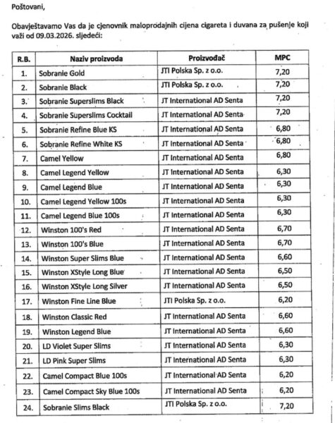 Iz UIO BiH podsjećaju da su proizvođači i distributeri dužni prijaviti svaku promjenu maloprodajnih cijena, te da se nove cijene primjenjuju od datuma koji je naveden u prijavi. Razlozi korekcije cijena nisu detaljno obrazloženi, ali se u pravilu odnose na usklađivanje sa poreznim opterećenjima, trošarinama i tržišnim kretanjima.